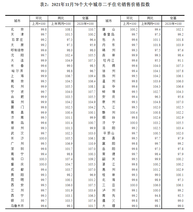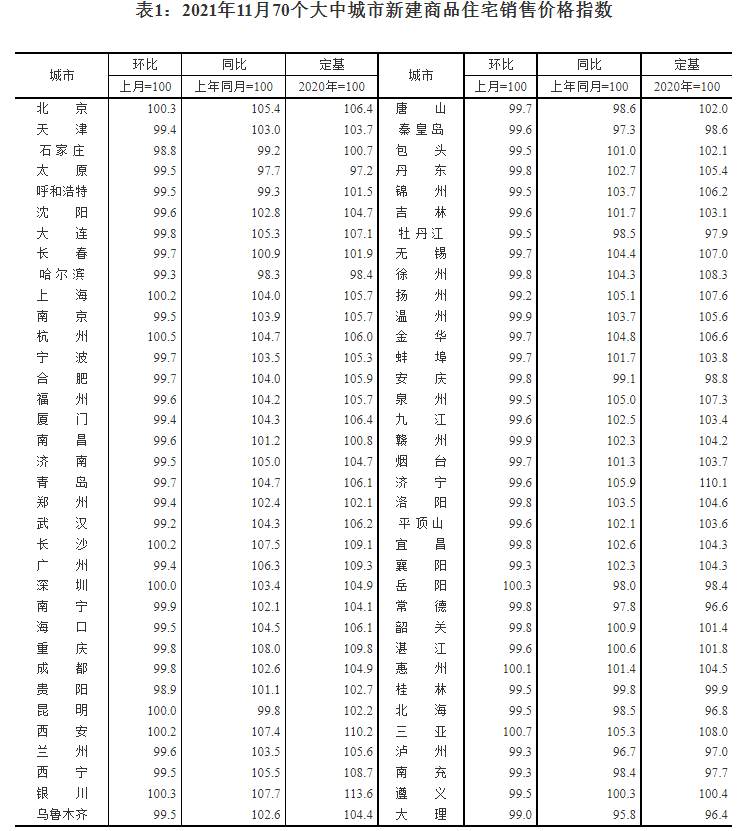 2021年11月份,70个大中城市商品住宅销售价格环比延续下降态势,同比涨幅持续回落。