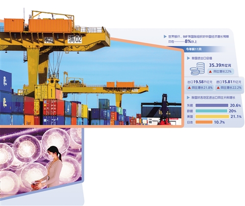2021年,供应短缺问题之严重有增无减。中国多措并举、多点发力,不断提升供应链产业链韧性,有效填补了疫情冲击下全球市场出现的巨大供给缺口。前11月,中国出口总值19.58万亿元,同比增长21.8%,其中对东盟、欧盟、美国等主要贸易伙伴出口均保持两位数增长。