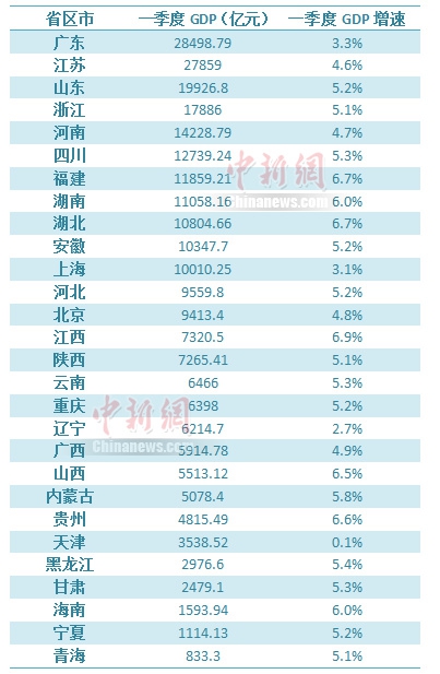 从GDP总量来看,广东、江苏、山东前三强的格局没有变化。广东依然是GDP总量的“老大”,一季度GDP超过2.8万亿元。