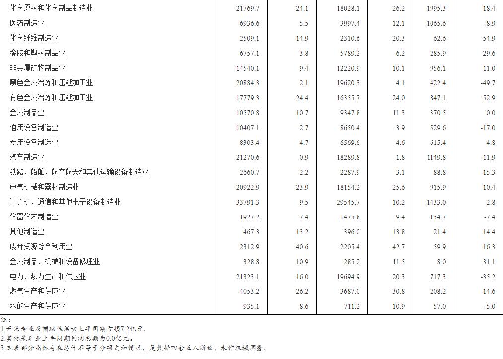 二、规模以上工业企业利润总额、营业收入等指标的增速均按可比口径计算。报告期数据与上年所公布的同指标数据之间有不可比因素,不能直接相比计算增速。其主要原因是:(一)根据统计制度,每年定期对规模以上工业企业调查范围进行调整。每年有部分企业达到规模标准纳入调查范围,也有部分企业因规模变小而退出调查范围,还有新建投产企业、破产、注(吊)销企业等变化。(二)加强统计执法,对统计执法检查中发现的不符合规模以上工业统计要求的企业进行了清理,对相关基数依规进行了修正。(三)加强数据质量管理,剔除跨地区、跨行业重复统计数据。