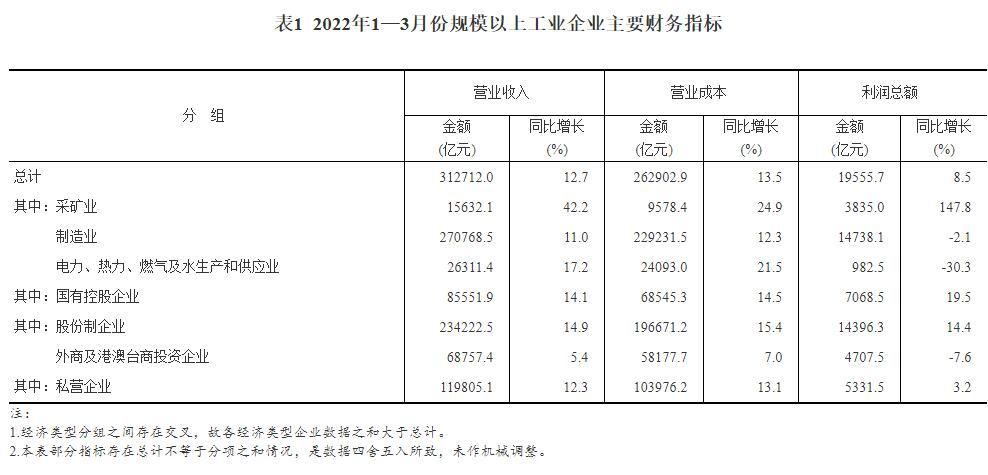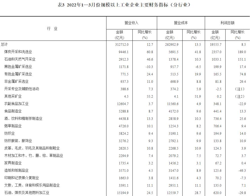 1—3月份,全国规模以上工业企业实现利润总额19555.7亿元,同比增长8.5%(按可比口径计算,详见附注二)。