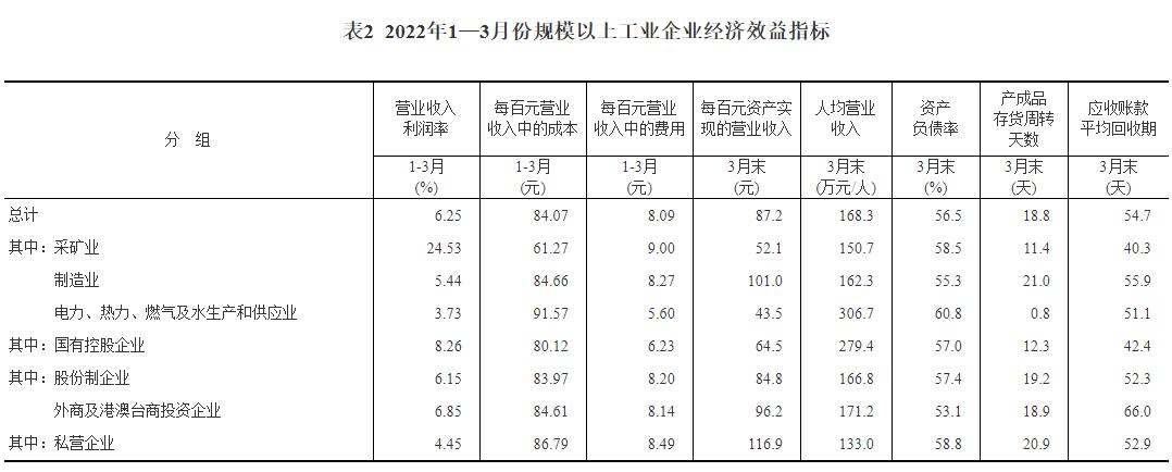 3月末,规模以上工业企业每百元资产实现的营业收入为87.2元,同比增加1.7元;人均营业收入为168.3万元,同比增加18.1万元;产成品存货周转天数为18.8天,同比增加0.6天;应收账款平均回收期为54.7天,同比增加0.9天。