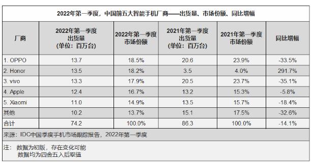 市场研究机构IDC发布的报告数据显示,2022年第一季度,中国智能手机市场出货量约7420万台,同比下降14.1%。