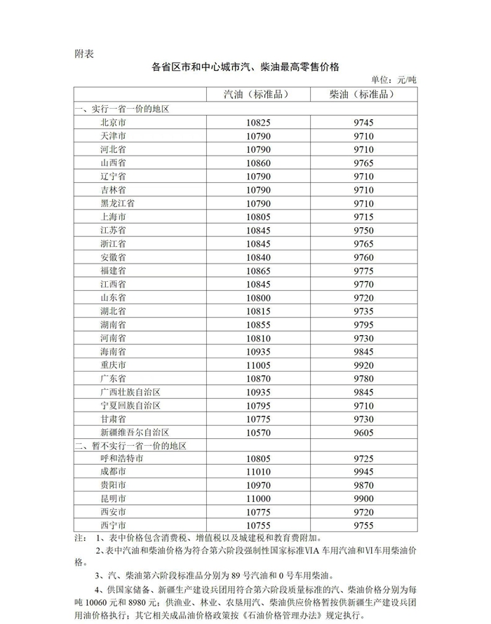 根据近期国际市场油价变化情况,按照现行成品油价格形成机制,自2022年5月16日24时起,国内汽、柴油价格(标准品,下同)每吨分别提高285元和270元。调整后,各省(区、市)和中心城市汽、柴油最高零售价格见附表。相关价格联动及补贴政策按现行规定执行。
