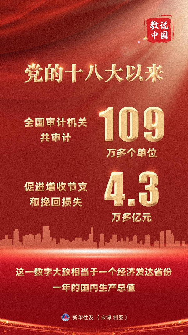 北京5月17日电(记者邹多为、胡锐)党的十八大以来,全国审计机关共审计109万多个单位,促进增收节支和挽回损失4.3万多亿元,这一数字大致相当于一个经济发达省份一年的国内生产总值。
