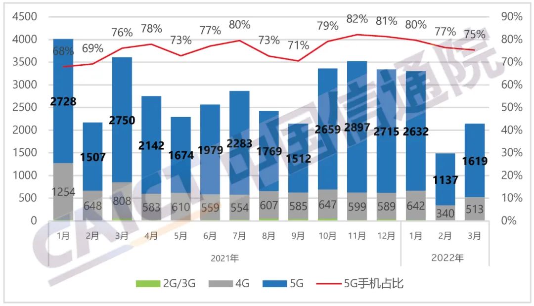 根据中国信通院发布的数据显示,2022年3月,国内市场手机出货量2146万部,同比下降40.5%,其中,5G手机出货量为1618.5万部,同比下降41.1%,占同期手机出货量的75.4%。