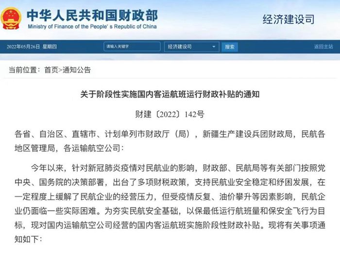 记者26日了解到,财政部、民航局日前发布通知,自2022年5月21日至2022年7月20日,对国内运输航空公司经营的国内客运航班实施阶段性财政补贴。原则上当每周内日均国内客运航班量低于或等于4500班(保持安全运行最低飞行航班数)时,启动财政补贴。对国内客运航班实际收入扣减变动成本后的亏损额给予补贴。设定最高亏损额补贴标准上限为每小时2.4万元。(记者申铖、周圆)