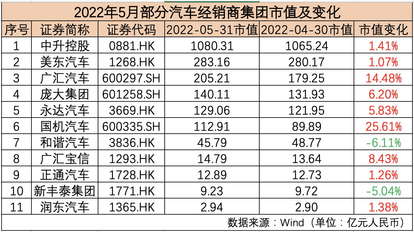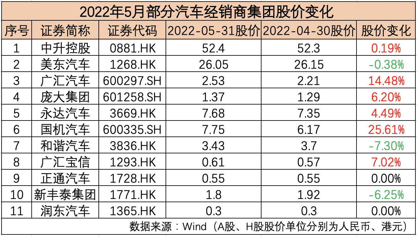 5月,国内11家汽车经销商集团表现不一,有3家企业股价出现下滑,6家企业股价呈增长趋势,1家企业股价未发生变动,1家(润东汽车;1365.HK)公司保持停盘状态。11家汽车经销商集团市值合计较4月增加80.21亿元。