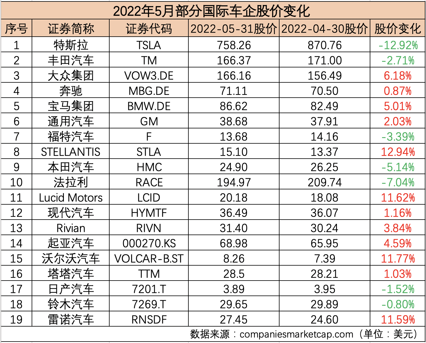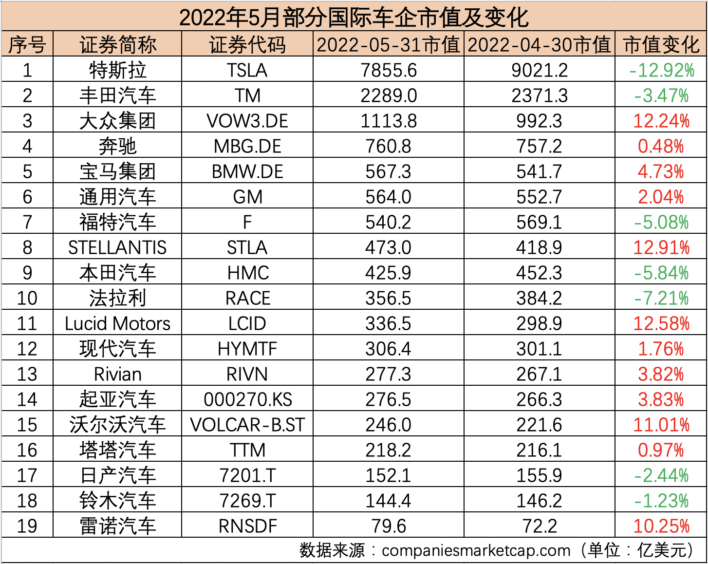 具体来看,19家国际车企中,有12家企业市值出现环比增长,而特斯拉(TSLA)5月市值环比减少12.92%,未能回到万亿美元市值,但依旧蝉联榜首之位。