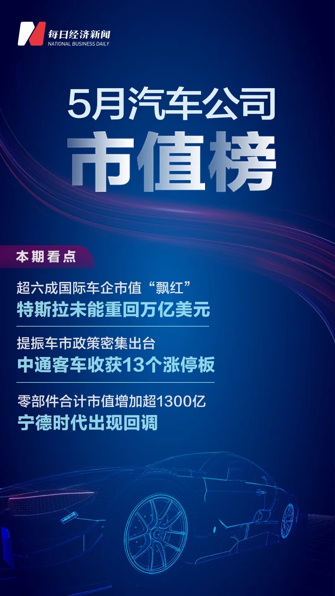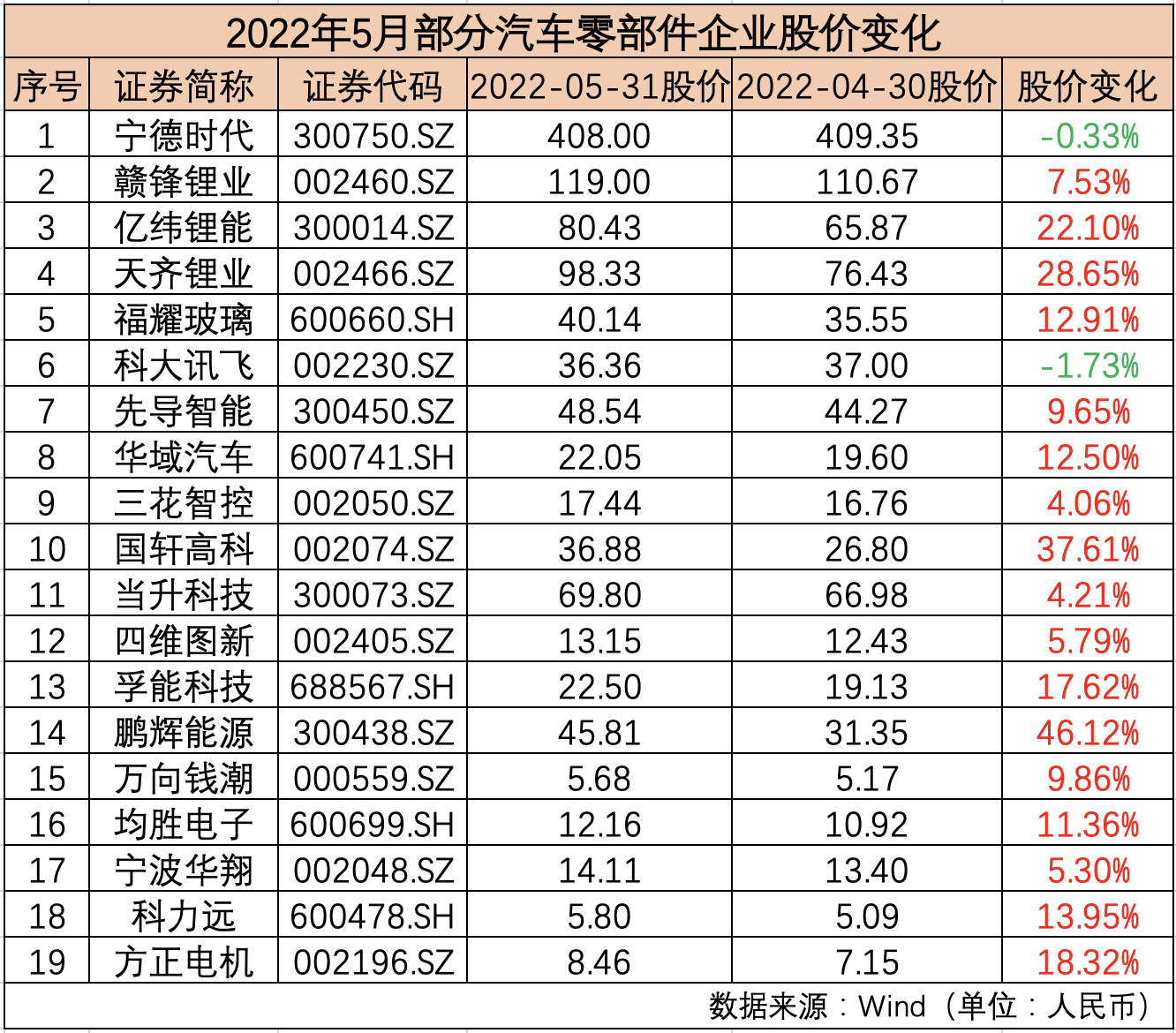 汽车零部件板块方面,在记者统计的19家零部件企业中,仅宁德时代(300750.SZ)和科大讯飞(002230.SZ)市值出现回调,其余17家企业市值均出现不同程度上涨,19家零部件车企5月市值合计环比增加1318.05亿元。