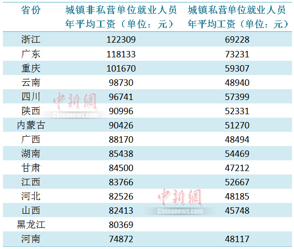 在这15个省份中,浙江、广东、重庆的城镇非私营单位就业人员年平均工资超过10万元大关。