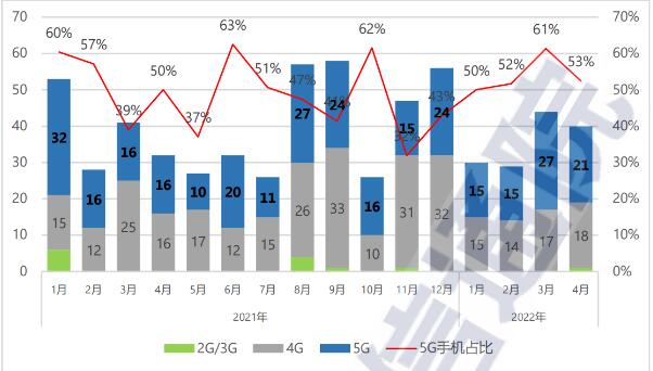 2022年1-4月,上市新机型累计143款,同比下降7.1%,其中5G手机78款,同比下降2.5%,占同期手机上市新机型数量的54.5%。