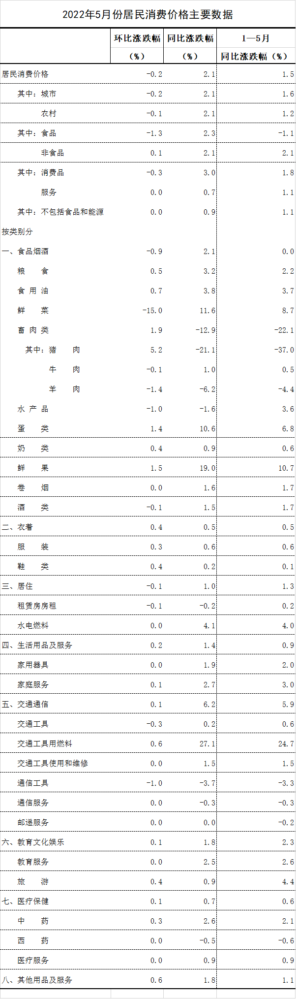 2022年5月份,全国居民消费价格同比上涨2.1%。其中,城市上涨2.1%,农村上涨2.1%;食品价格上涨2.3%,非食品价格上涨2.1%;消费品价格上涨3.0%,服务价格上涨0.7%。1—5月平均,全国居民消费价格比上年同期上涨1.5%。