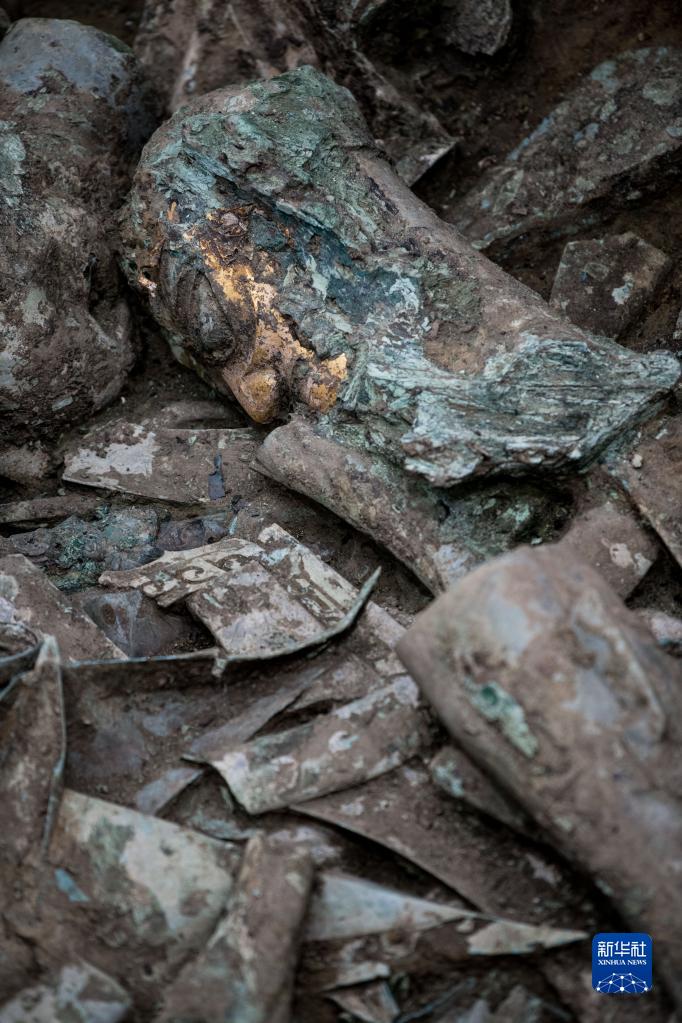 这是在三星堆遗址8号“祭祀坑”拍摄的铜人像(6月1日摄)。新华社记者 王曦 摄