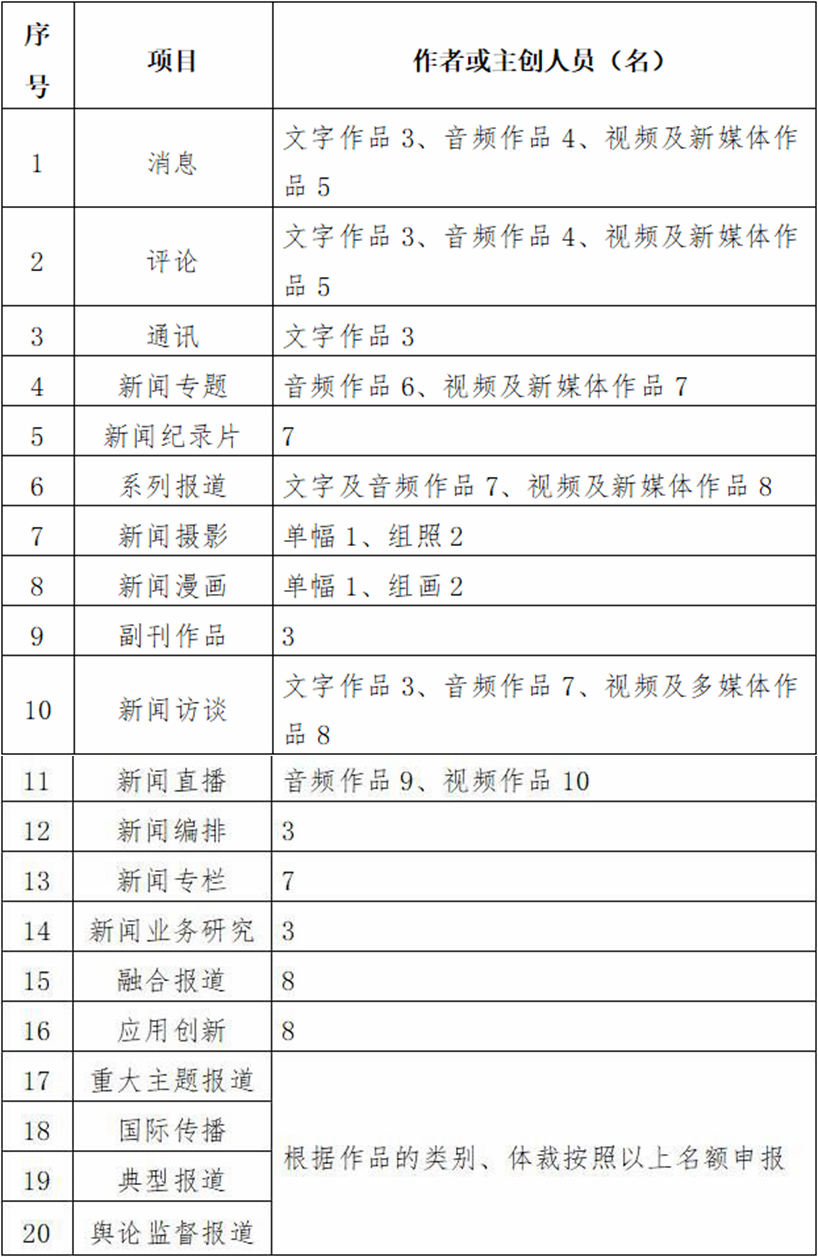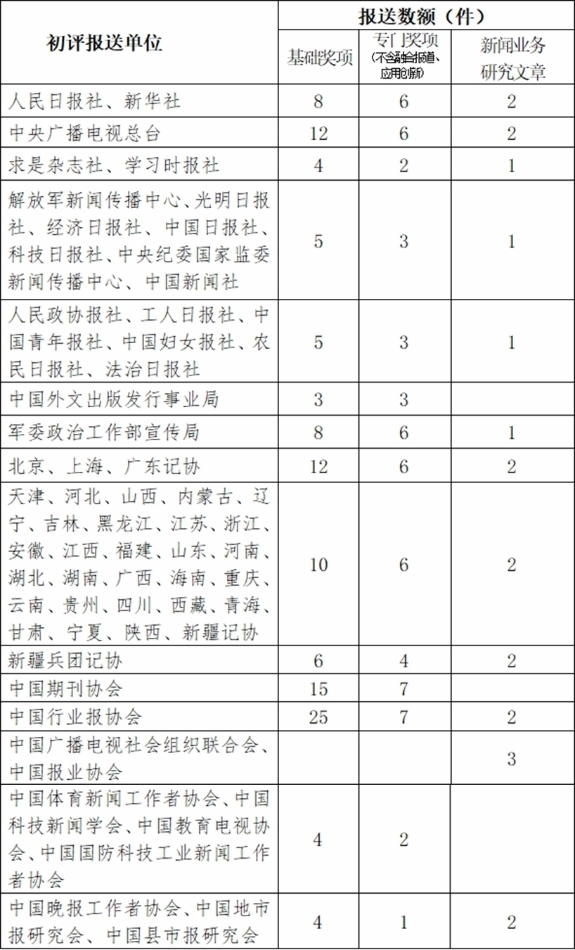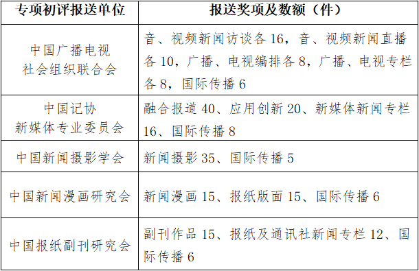 中国记协委托专业协会承担部分作品的专项初评,报送专项初评的作品名额由相关专业协会另行通知。