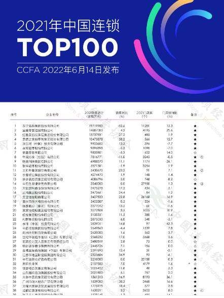 根据2021年行业基本情况调查结果,中国连锁经营协会(CCFA)6月14日发布“2021年中国连锁Top100”。