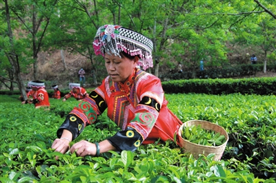 安石村村民在茶地里采茶。黄建林 摄