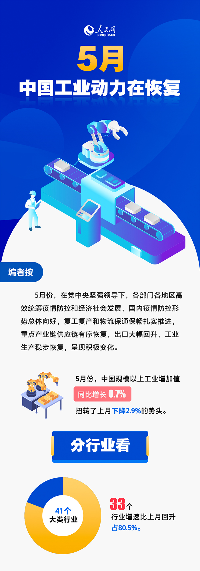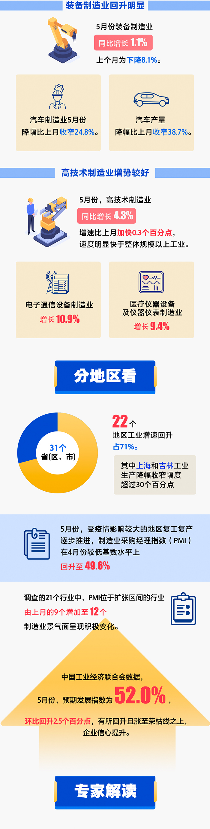 5月份,随着我国统筹疫情防控和经济社会发展的措施逐步落地生效,国内疫情防控形势总体向好,复工复产和物流保通保畅扎实推进,重点产业链供应链有序恢复,出口大幅回升,工业生产稳步恢复,呈现积极变化。