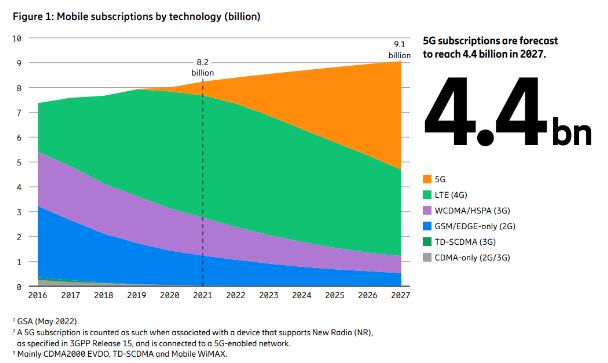 今年第一季度期间,全球5G用户数增长了7000万至约6.2亿,4G用户数增长7000万至49亿。根据爱立信的预测,全球5G用户数在2027年将达到44亿。