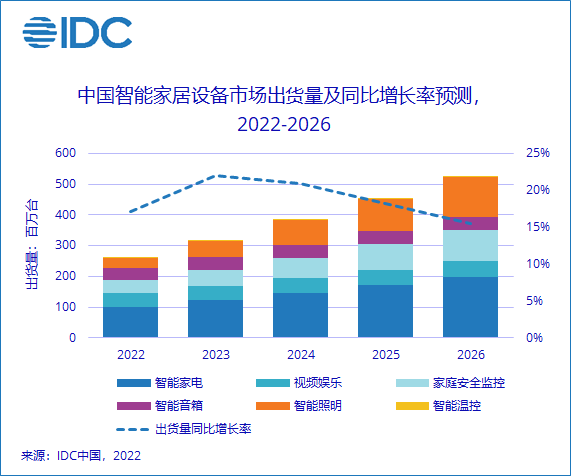 IDC数据显示,2021年中国智能家居设备市场出货量超过2.2亿台,同比增长9.2%。虽然市场在供需双方压力之下并未出现两位数的反弹,但出货体量背后不可忽视的是中国智能家居市场的升级和调整。在不断的优化中,市场将迎来新的发展机会,预计2022年中国智能家居设备市场出货量将突破2.6亿台,同比增长17.1%。