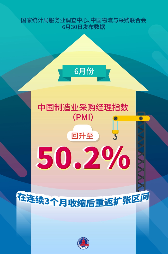 北京6月30日电(记者魏玉坤)国家统计局服务业调查中心、中国物流与采购联合会6月30日发布数据,6月份,中国制造业采购经理指数(PMI)回升至50.2%,在连续3个月收缩后重返扩张区间。