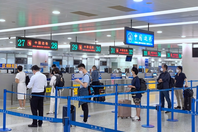 上海机场边检站开足通道,保障旅客快速通关。新华网发
