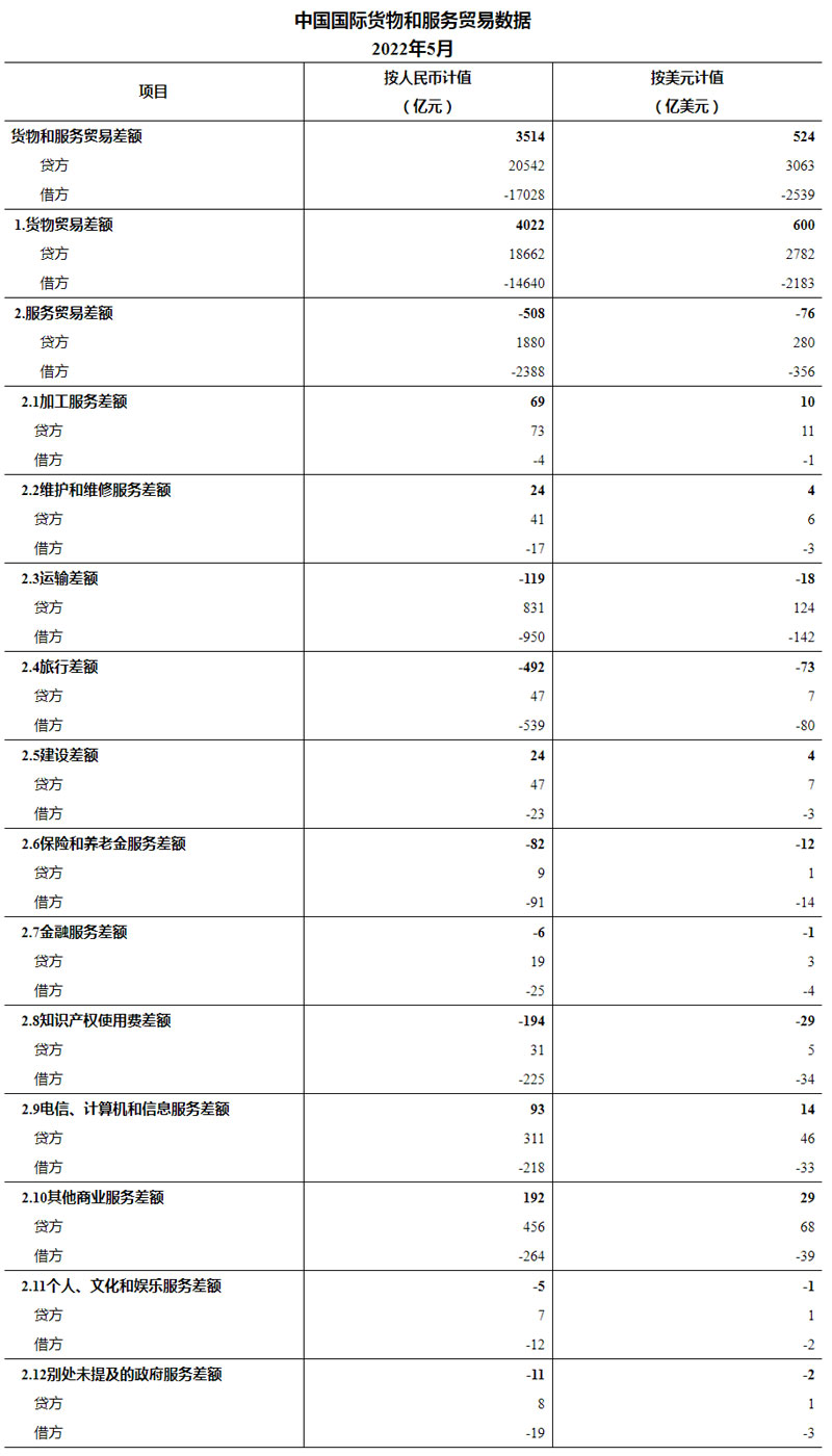 2.国际货物和服务贸易数据按美元编制,当月人民币计值数据由美元数据按月均人民币对美元中间价折算得到。