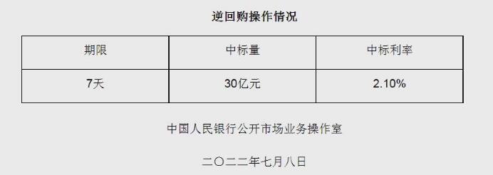 7月8日电 央行网站8日消息,为维护银行体系流动性合理充裕,2022年7月8日中国人民银行以利率招标方式开展了30亿元逆回购操作,期限为7天,中标利率2.10%。(中新财经)