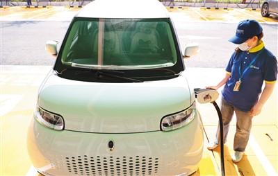 江苏省连云港市海州区依托新能源汽车充电场站项目,全力打造区域形象示范充电站,逐渐形成以核心区域为重点的“1公里”公共充电服务圈。图为在连云港市海州公园充电场站,工作人员给电动汽车充电。耿玉和摄(人民视觉)