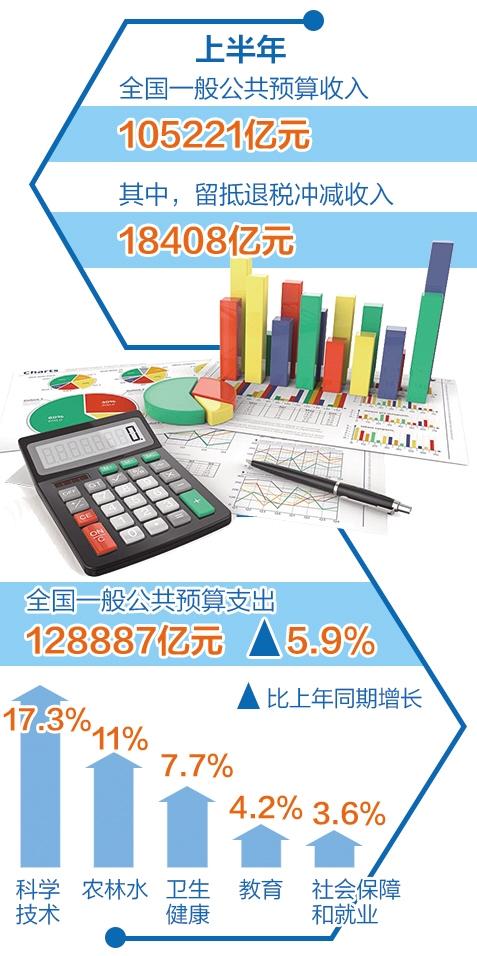 从财政支出看,上半年,全国一般公共预算支出128887亿元,比上年同期增长5.9%,高于财政收入增幅。民生等重点领域支出得到有力保障,其中,科学技术、农林水、卫生健康、教育、社会保障和就业支出,分别增长17.3%、11%、7.7%、4.2%、3.6%。