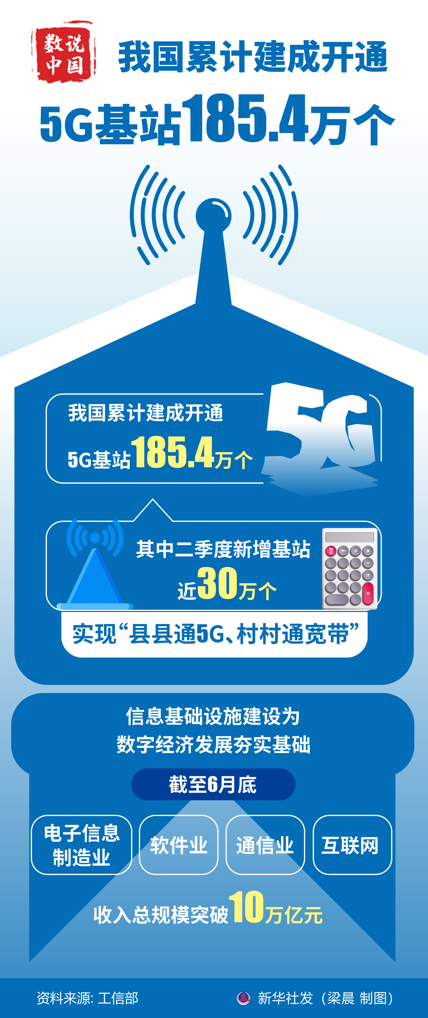 北京7月19日电(记者张辛欣)工信部信息通信管理局负责人王鹏19日在国新办发布会上表示,我国累计建成开通5G基站185.4万个,其中二季度新增基站近30万个,实现“县县通5G、村村通宽带”。