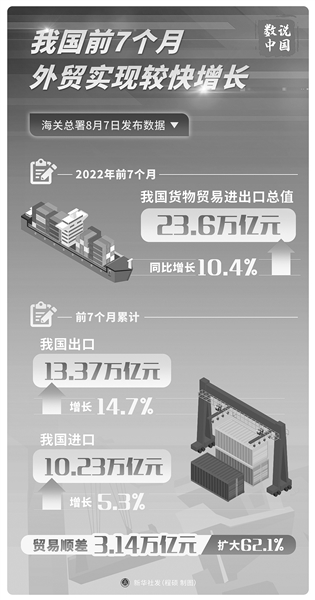 从贸易伙伴来看,前7个月,对东盟、欧盟、美国和韩国等主要贸易伙伴进出口均保持增长,其中我国对上述市场出口增速分别为19.1%、19.7%、15.1%、17.9%;同期,我国对“一带一路”沿线国家合计进出口7.55万亿元,增长19.8%。