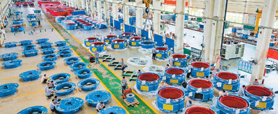 图为日前,江苏南京江宁高新园区的厂房内,工人们正全力组装中速永磁风力发电机。新机型订单量持续攀升,预计三季度工作量较去年同期增长50%。