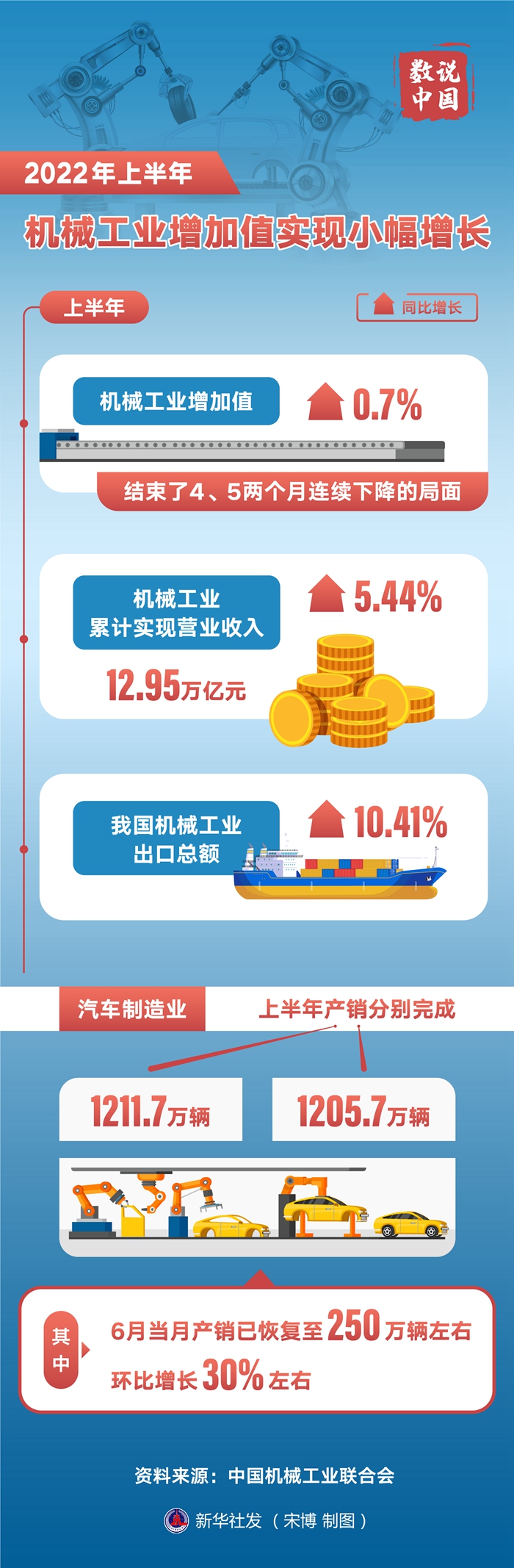 中国机械工业联合会数据显示,上半年机械工业累计实现营业收入12.95万亿元,同比增长5.44%,机械工业重点监测的120种主要产品中,5、6两月产量实现增长的产品数量逐步增加,6月份产量增长的品种已接近半数。