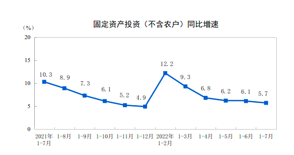 8月15日,国家统计局发布的7月份宏观经济数据显示,1-7月,全国固定资产投资同比增长5.7%,涨幅较前6个月回落0.4个百分点。7月社会消费品零售总额同比增长2.7%,涨幅比上月回落0.4个百分点,规模以上工业增加值同比上涨3.8%,涨幅比上月下降0.1个百分点。