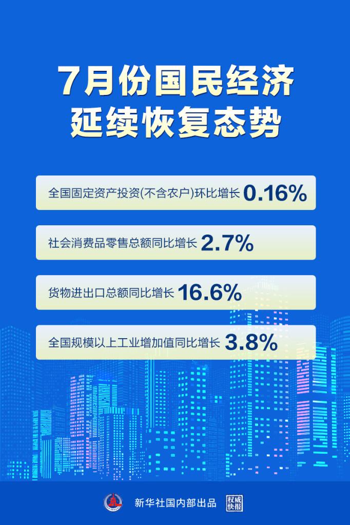 8月15日电(记者魏玉坤、王雨萧)国家统计局15日发布数据显示,7月份,生产供给继续恢复,就业物价总体平稳,对外贸易增势良好,民生保障有力有效,国民经济延续恢复态势。