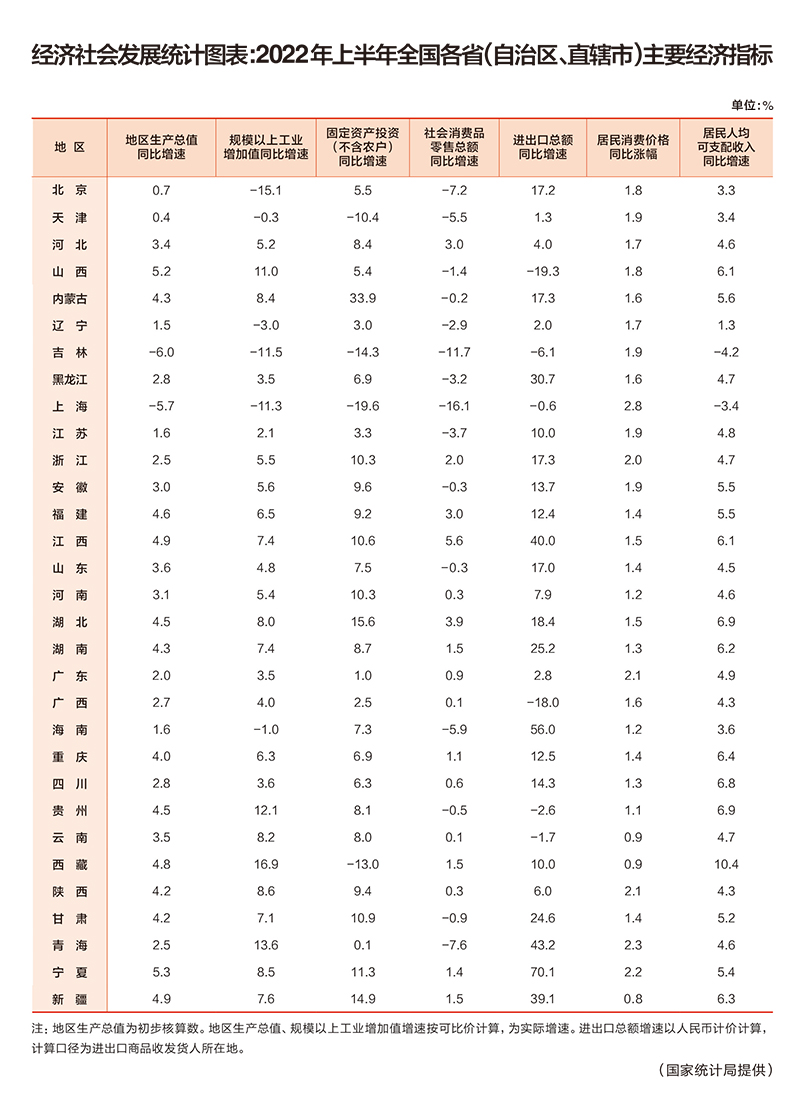 2022上半年全国各省(自治区、直辖市)主要经济指标