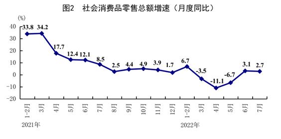 看消费。7月份,社会消费品零售总额同比增长2.7%,增速比上月回落0.4个百分点。