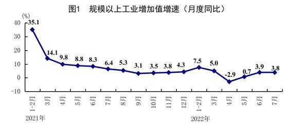 看工业。7月份,全国规模以上工业增加值同比增长3.8%,比上月回落0.1个百分点;环比增长0.38%。