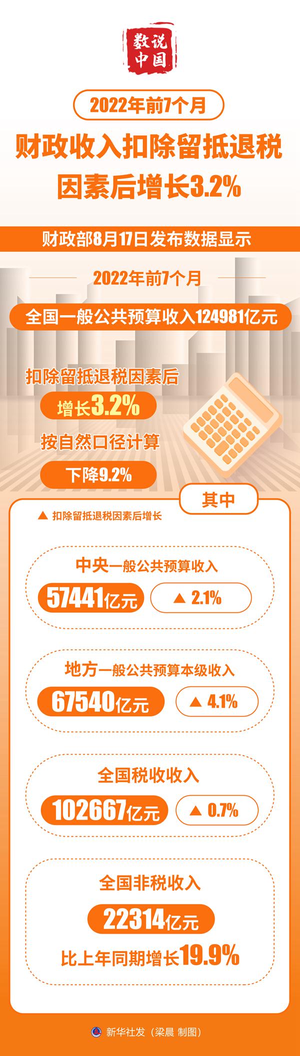 8月17日电(记者申铖)财政部17日发布数据显示,今年前7个月,全国一般公共预算收入124981亿元,扣除留抵退税因素后增长3.2%,按自然口径计算下降9.2%。