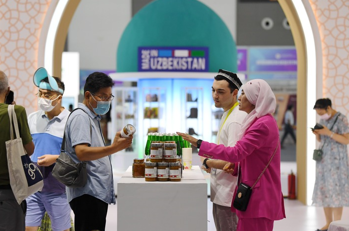 8月14日,参观者在第六届丝绸之路国际博览会主宾国乌兹别克斯坦展区上了解当地特色商品。 新华社记者 李一博 摄