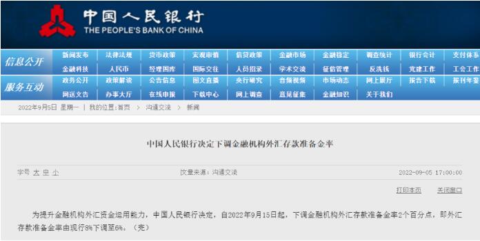 为提升金融机构外汇资金运用能力,中国人民银行决定,自2022年9月15日起,下调金融机构外汇存款准备金率2个百分点,即外汇存款准备金率由现行8%下调至6%。