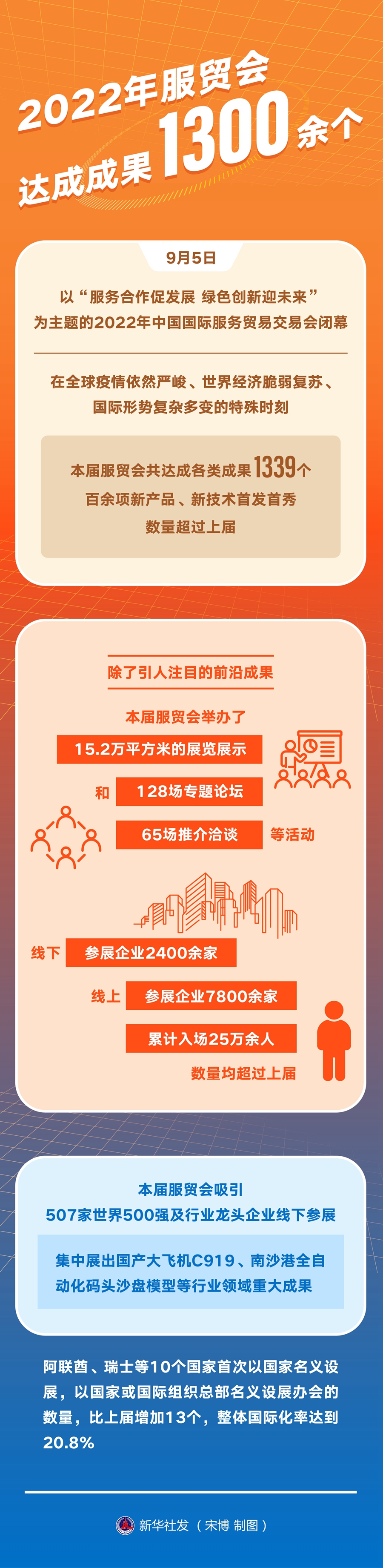 北京9月5日电(记者吉宁)9月5日,以“服务合作促发展 绿色创新迎未来”为主题的2022年中国国际服务贸易交易会闭幕。在全球疫情依然严峻、世界经济脆弱复苏、国际形势复杂多变的特殊时刻,本届服贸会共达成各类成果1339个,百余项新产品、新技术首发首秀,数量超过上届。
