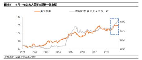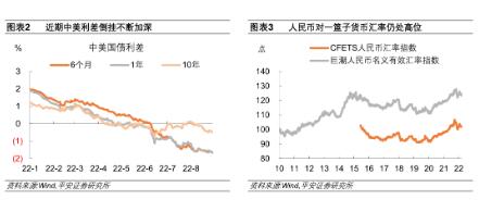 另一方面,中美货币政策分化加深。8月15日中国人民银行意外祭出降息工具,大超市场预期,释放了货币政策“以我为主”、继续宽松的确凿信号。相对于正以坚定加息对抗通胀的美联储、或将跟进75bp加息幅度的欧央行,中国与海外的货币政策差异显著拉大,令中美国债收益率倒挂程度进一步加深。特别是,8月22日以来,美元指数高位企稳,但人民币对美元汇率仍在以较快速度走贬,中美货币政策分化(背后是中美经济周期的分化)的影响更趋主导。
