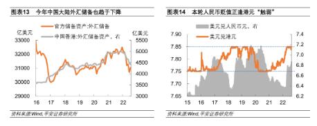 同时,汇率因素对我国货币政策的掣肘可能重新强化。尤其是,港元汇率在美联储加息过程中或将持续处于弱方兑换保证附近,捍卫香港联系汇率制度对香港金管局外汇储备的消耗较大。而中国大陆作为港元的最坚强后盾,今年以来我们的外汇储备规模也趋于下降。因此,需要采取更加适度的货币政策、更有针对性的稳增长政策,避免人民币急贬与港元触发弱方兑换保证形成共振。
