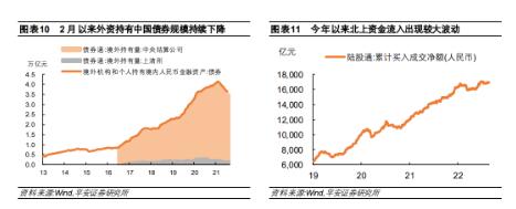 3)中美利差倒挂对于证券投资项目转为逆差形成了重要拖累。今年2月以来,外资持有中国债券的规模持续下降,中美利差走向倒挂是其主要原因,该因素或将至少贯穿本年度。而股票市场上北向资金流入今年出现了较大波动:3月由于中美审计监管问题而出现快速流出,5-7月逐步回流,近期北向资金流入再度出现明显放缓。