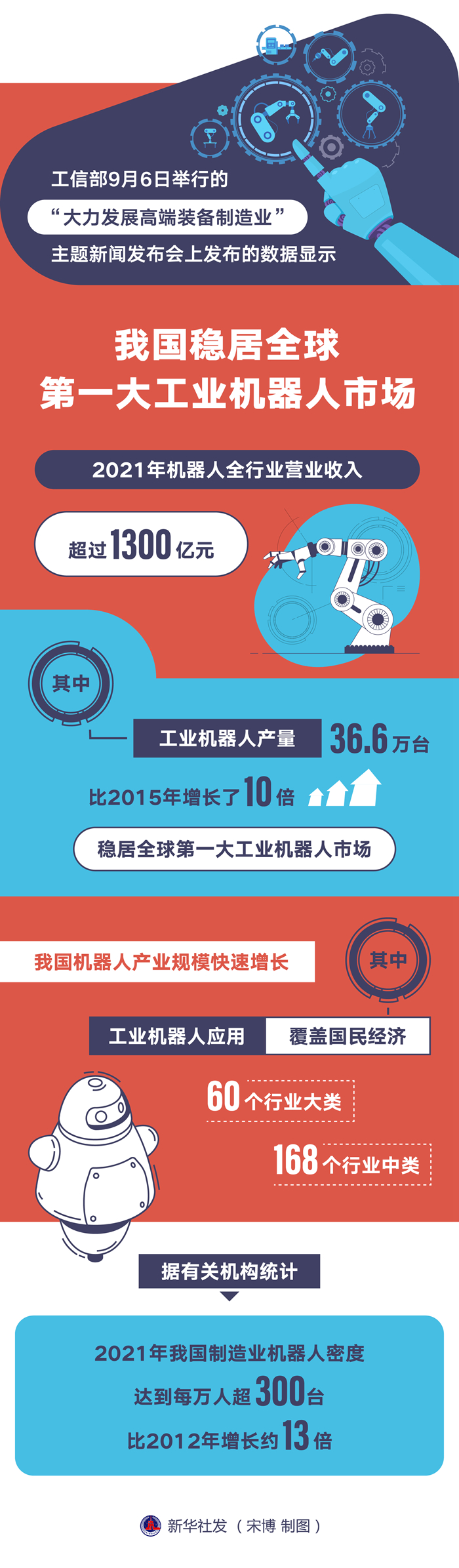 北京9月6日电(记者张辛欣)工信部装备工业一司副司长郭守刚6日表示,我国机器人产业规模快速增长,2021年机器人全行业营业收入超过1300亿元。其中,工业机器人产量达36.6万台,比2015年增长了10倍,稳居全球第一大工业机器人市场。