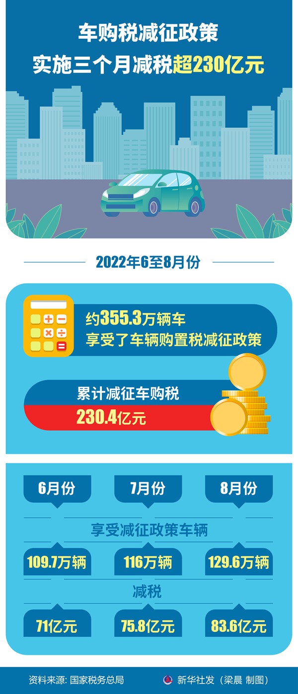 9月11日电(记者王雨萧)记者11日从国家税务总局获悉,今年6至8月份,约355.3万辆车享受了车辆购置税减征政策,累计减征车购税230.4亿元。