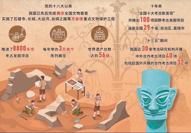 党的十八大以来,中华文明探源工程、“考古中国”成果丰硕,8800多项考古发掘项目陆续实施,为科学阐释中国境内人类起源、农业起源、文明起源等关键问题提供珍贵实物证据。与此同时,中国考古在科技考古、多学科交叉考古、边疆考古、申请世界遗产、国际联合考古和办展等方面都取得了显著成效,逐渐形成新时代考古学的中国特色、中国风格、中国气派。