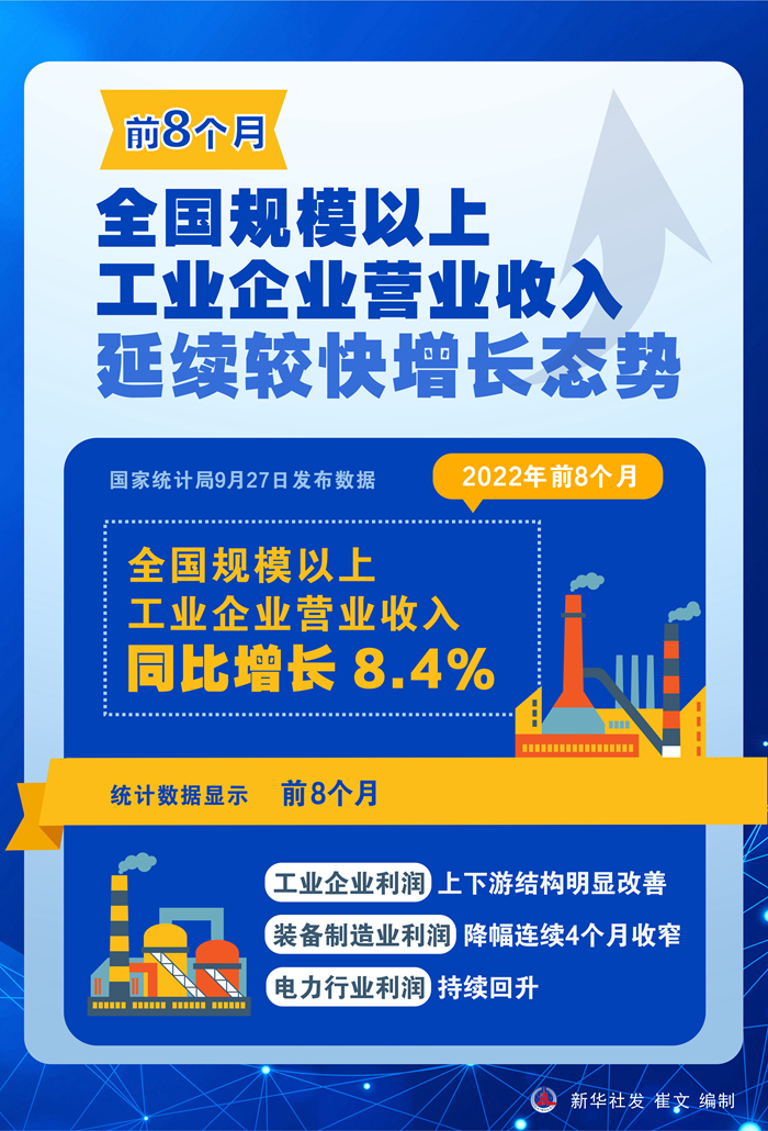 北京9月27日电(记者魏玉坤)国家统计局27日发布数据,今年前8个月,全国规模以上工业企业营业收入同比增长8.4%,延续较快增长态势;企业利润同比下降2.1%。